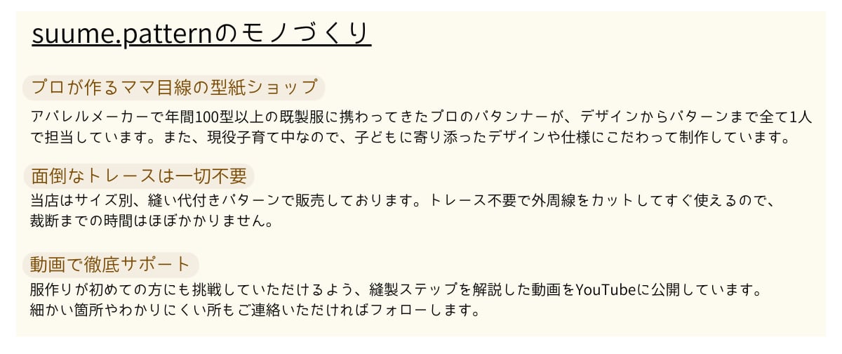 ■サイズ展開: 100 / 110 / 120 ■難易度:★★★☆☆ ■できあがり寸法 100(股下7cm、ウエスト45cm、ヒップ41.9cm) 110(股下8cm、ウエスト48cm、ヒップ44.9cm) 120(股下9cm、ウエスト50cm、ヒップ46.9cm) ■商品セット内容 ・型紙・・・A3用紙を二つ折りにした状態でお届けします。一部お客様自身で貼り合わせ作業をお願いしております。型紙に関する詳細は下記リンクをご確認ください。 https://coco-pattern.com/how-to-attach-the-pattern-pieces/ ★作り方はYouTubeにて公開しています。ご活用ください。 https://youtu.be/agfxMWGlmPo ■ミシン ・直線縫いミシン ・ロックミシン(家庭用ミシンの裁ち目かがりでもOK) ■推奨生地:厚み/中厚(コーデュロイ、ポンチ、デニムなど) ■その他の材料 ・接着芯→見返しに使用 ・伸び止めテープ→ストレートorハーフバイヤス、10mm前後巾 ・平ゴム25mm巾(ゴム寸法目安はパターンに記載) ■商用利用: 可 -------------------------------------------------------- 【suume.pattern(シューミー.パターン)】 子どもと過ごす日常に、手作りのぬくもりを。 「suume.pattern」は、子育て中のママが“今作りたい”と思える実用的で可愛いアイテムをテーマにした型紙ブランドです。 初めてでも作りやすく、日々の暮らしに寄り添うデザインをお届けしています。