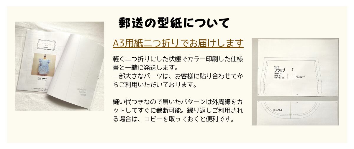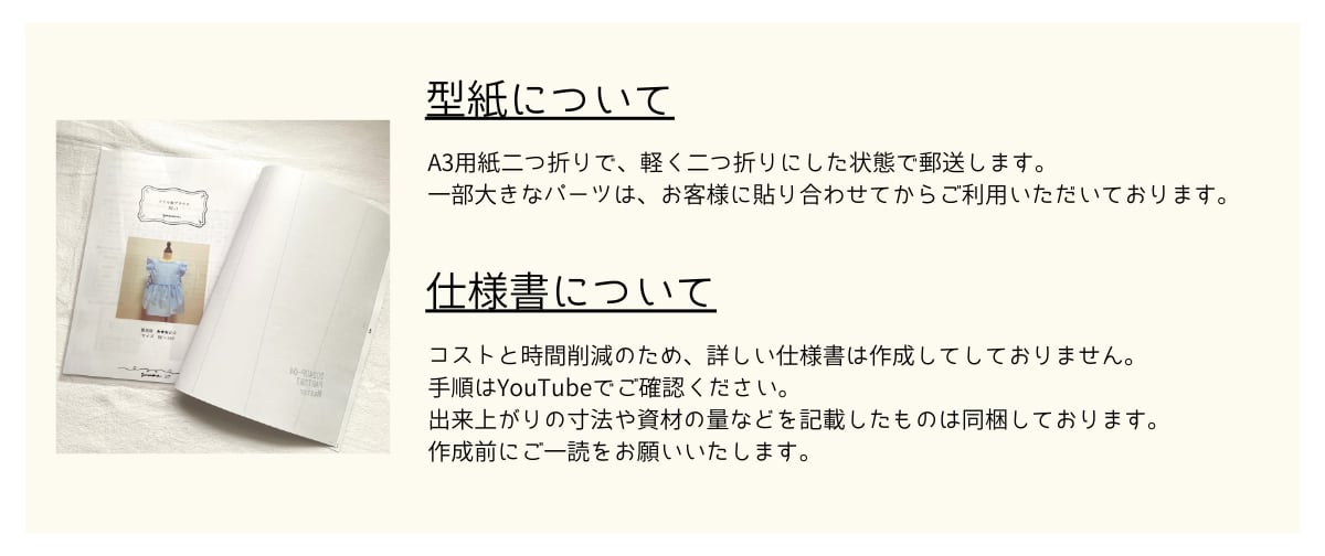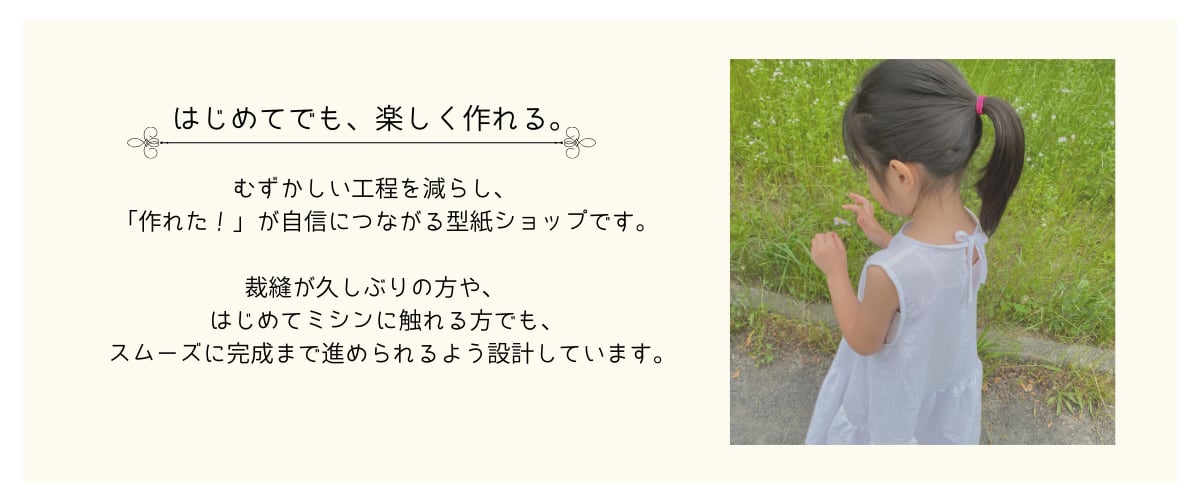 夏にぴったりな、肩が少し見える涼しげなデザイン♪ おしゃれが大好きな小さな女の子にも人気のデザインです。 ニット生地(カットソー素材)を使って、直線ミシンとロックミシンで仕立てています。 袖はひらっとしたフリル袖で動きやすく、見た目も可愛い仕上がりに◎ ロックミシンがない方は、家庭用ミシンのジグザグ縫いでもOKです。 ■サイズ展開:80 / 90 / 100 / 110 / 120 / 130 / 140 ■難易度:★★☆☆☆ ■できあがり寸法 80(着丈32cm) 90(着丈34cm) 100(着37cm) 110(着丈40cm) 120(着丈43cm) 130(着丈46cm) 140(着丈49cm) ■商品セット内容 ・型紙・・・A3用紙を二つ折りにした状態でお届けします。一部お客様自身で貼り合わせ作業をお願いしております。型紙に関する詳細は下記リンクをご確認ください。 https://coco-pattern.com/how-to-attach-the-pattern-pieces/ ★作り方はYouTubeにて公開しています。ご活用ください。 https://youtu.be/c4mOOoh9f1o ■ミシン 推奨→直線縫いミシン+ロックミシンorロックミシン 家庭用ミシンの直線縫い+ジグザグ縫いでも縫えますが、伸びないように ■推奨生地:ニット地(スムース、天竺が縫いやすくおすすめです) ※この型紙はニット用です。布帛ではお作りいただけません。 ■その他の材料 ・ニット用伸び止めテープ ■商用利用: 可 -------------------------------------------------------- 【suume.pattern(シューミー.パターン)】 子どもと過ごす日常に、手作りのぬくもりを。 「suume.pattern」は、子育て中のママが“今作りたい”と思える実用的で可愛いアイテムをテーマにした型紙ブランドです。 初めてでも作りやすく、日々の暮らしに寄り添うデザインをお届けしています。